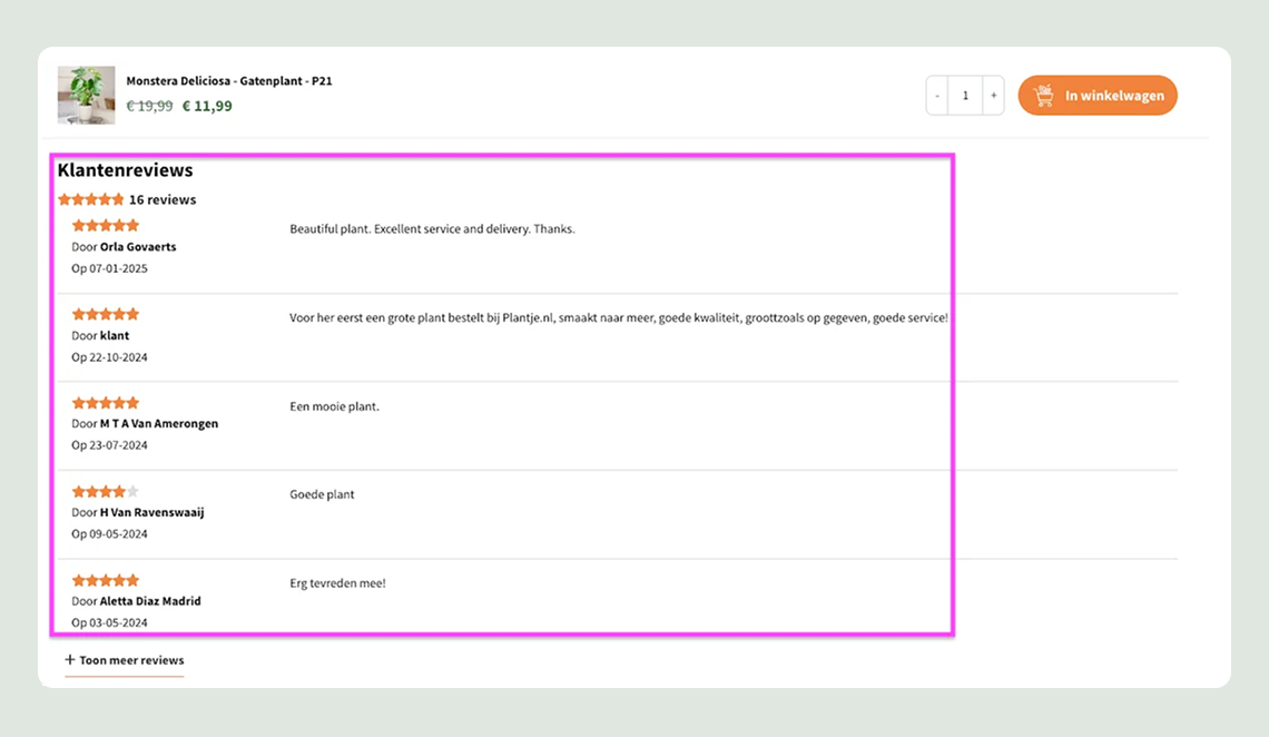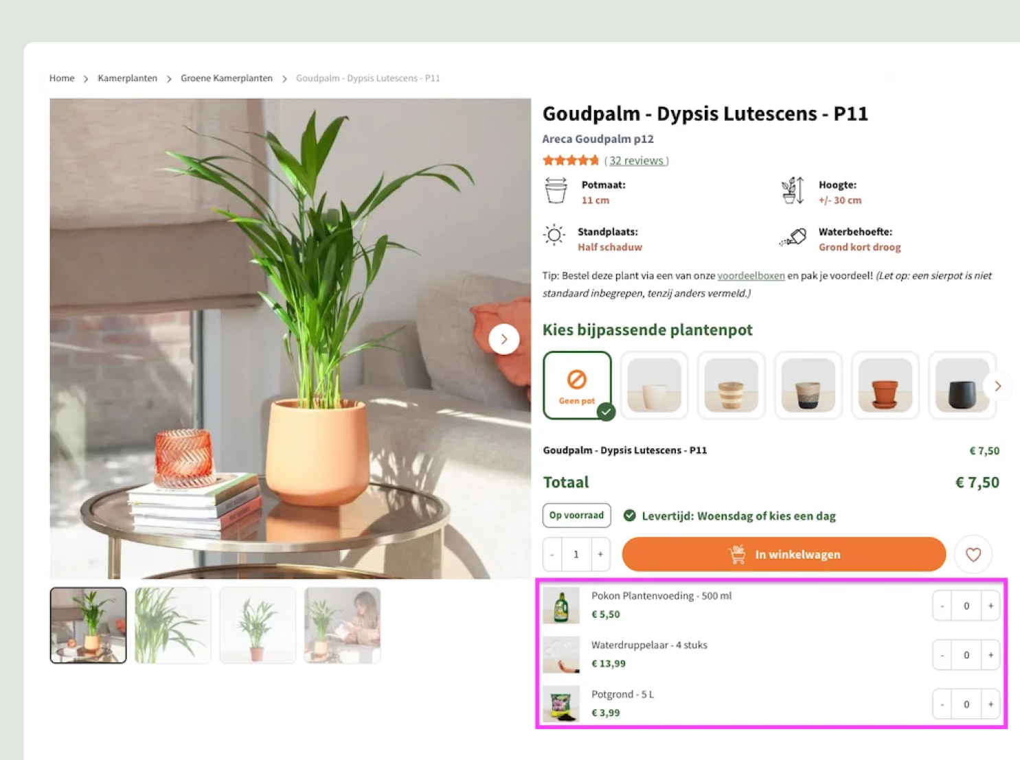 Onder de bestelknop worden relevante extra’s getoond, zoals potgrond, voeding of accessoires. Klanten kunnen deze direct toevoegen aan hun bestelling, wat gemak en extra omzet oplevert.