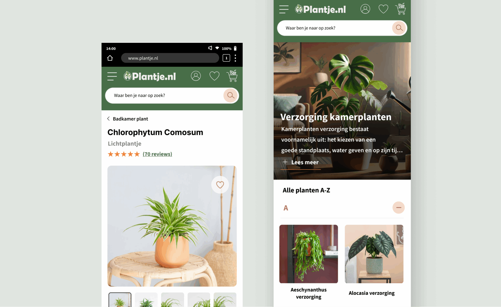 De verzorging pagina’s waren erg belangrijk voor het organische verkeer van Plantje. Onze designer creëerde een nieuw, visueel passend ontwerp dat goed aansluit bij de webshop. De pagina’s zijn heringericht en samengebracht in een aparte verzorging sectie, waardoor ze beter vindbaar én aantrekkelijker zijn.