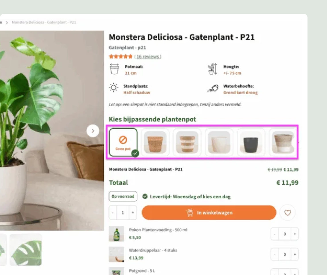 Op de productpagina van een plant ziet de klant automatisch de bijpassende bloempotten in de juiste maat. Dit voorkomt het bestellen van een verkeerde potmaat en maakt het eenvoudig om direct een passende pot mee te bestellen.