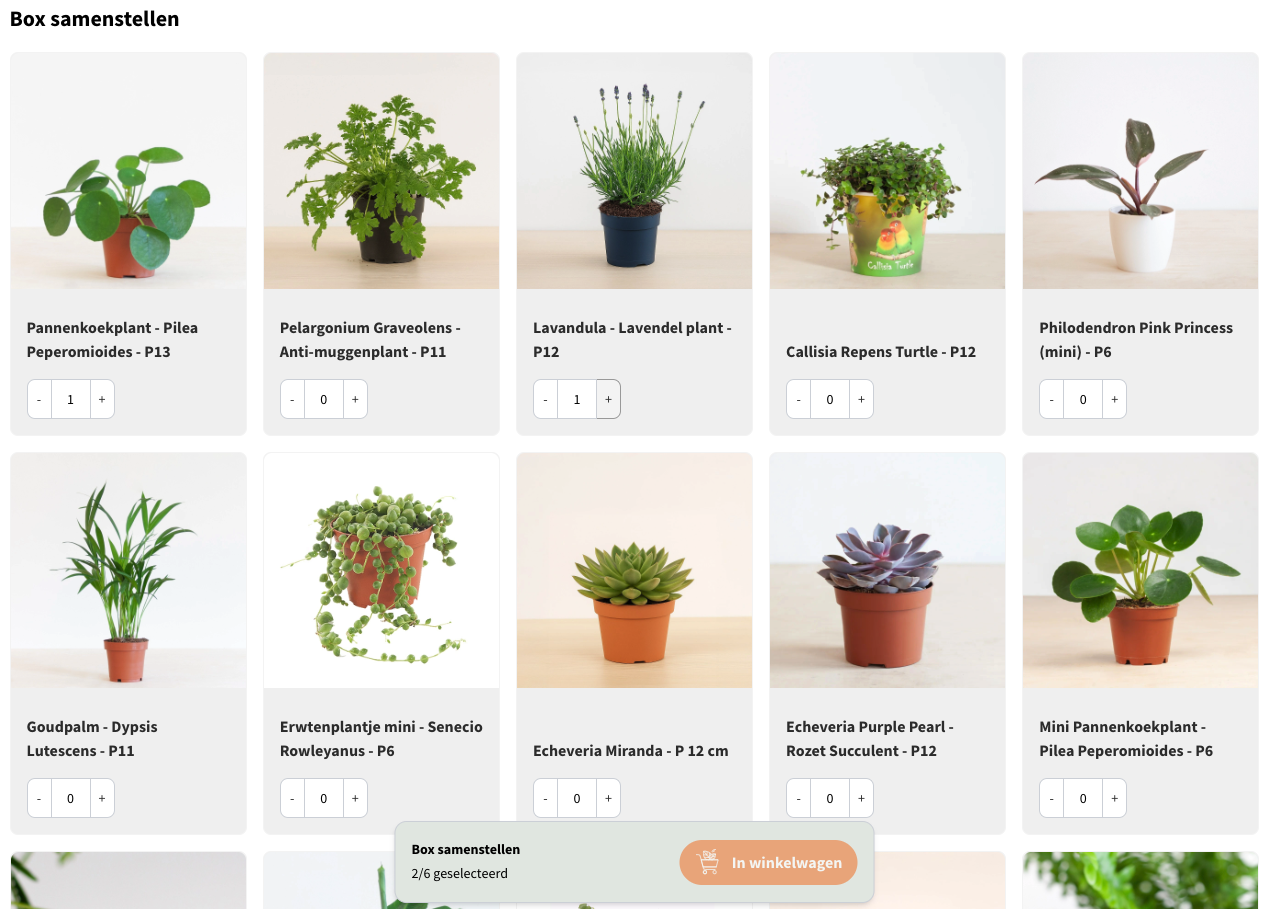Klanten stellen zelf een plantenbox samen binnen één product. Ze kiezen uit verschillende planten (maximaal aantal instelbaar), waarbij altijd de tweede productfoto wordt getoond voor een consistente weergave.
